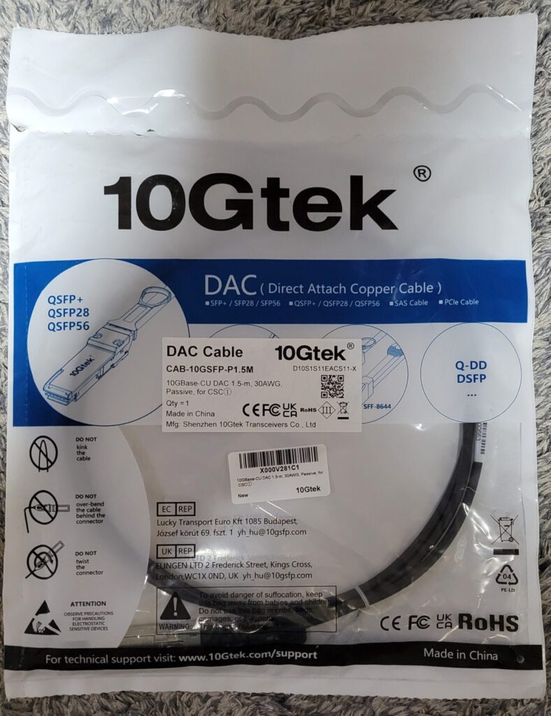 スイッチングハブのもう1つのSFP+ポートとメインPCは、上記のような変換モジュールを使用せず直接DAC(ダイレクトアタッチケーブル)で接続するので10ギガ対応のDACを用意します。モジュールとケーブルが一体化していてコストカットができますし、発熱や通信にかかる消費電力もかなり抑えることができる様です。(2千円くらい)